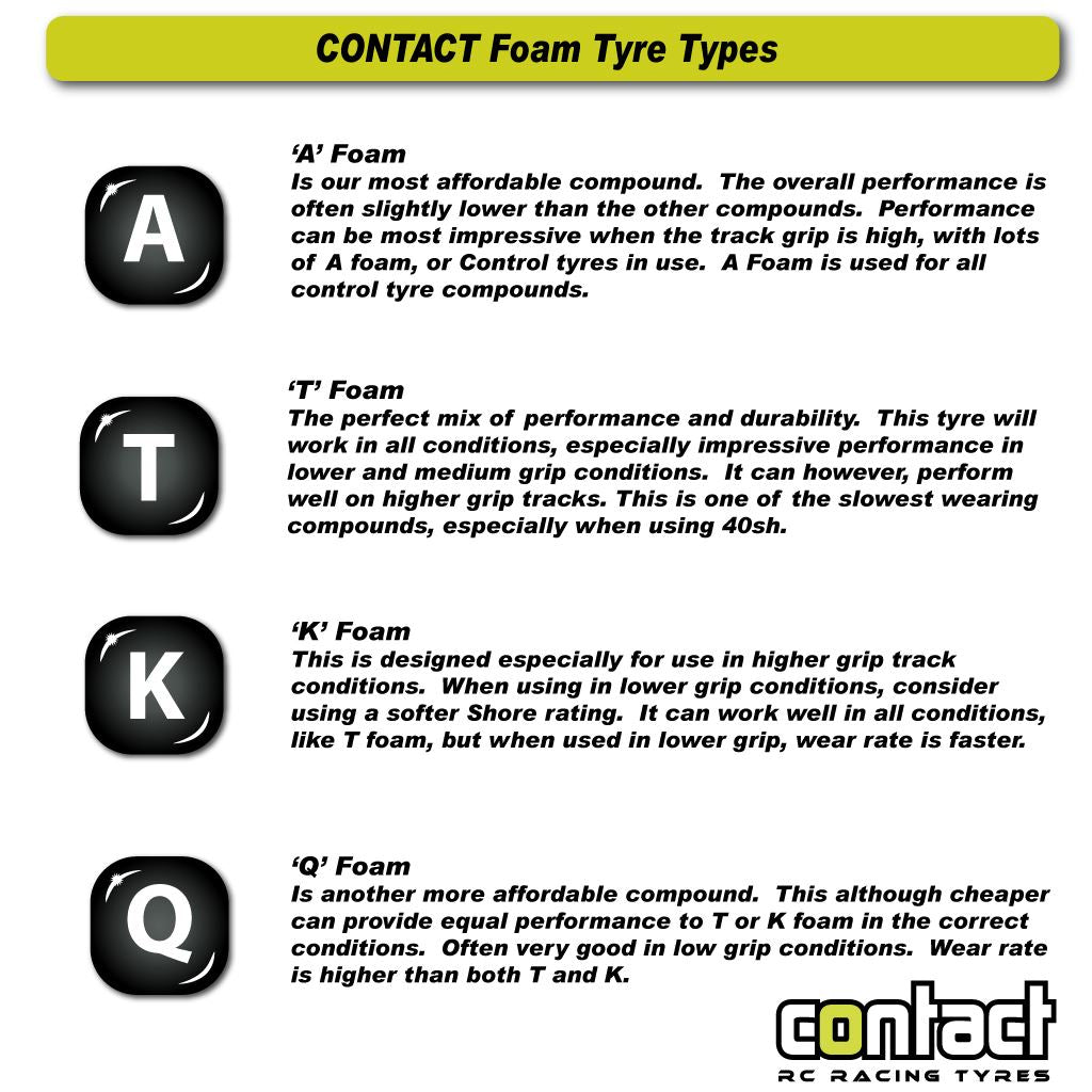 T foam is the most complete 1/12th tyre in the Contact RC range. It benefits from performance and lap times equal or better than Q foam, with the added benefit of being easier to drive, less twitchy and easy to attack the track with. This often leads to improved lap times. It also has much better durability, lower wear rates (close to A foam) and when using the non-oil type additives, keeps grip to the end of the race much better than our other options.
