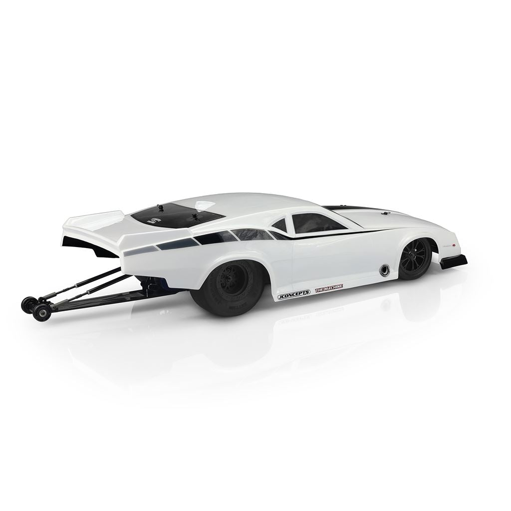 The front-end of the body is important to maximize the MPH and elapsed time during any pass. The heavy front-end rake allows the vehicle to hold tight on the “big end” of the race track. With just enough clearance to fit over most front suspension components, “The Machine” hangs tough in performance and aesthetics. A slight hood-scoop runs the center-line of the body over the crowned hood which makes perfect space for painting decoration or sponsor decals.