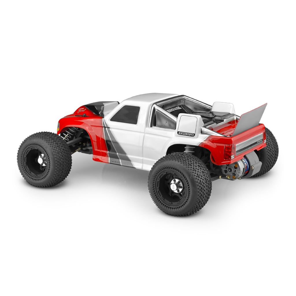 The JConcepts body is narrow and sits close against the chassis to give racers the Team Truck look popular in the 90’s. The styling is completely modeled after the most popular full-size truck of that era, the 1993 Ford F-150. The entire body shape has been chiseled, incorporating styling cues from the 1:1 truck including wheel well shapes, door lines, window outlines and rear tailgate. The front-end sits just behind the front bumper while the headlight and grille area looks strikingly stock and with included decal sheet, looks like its street truck counterpart.
