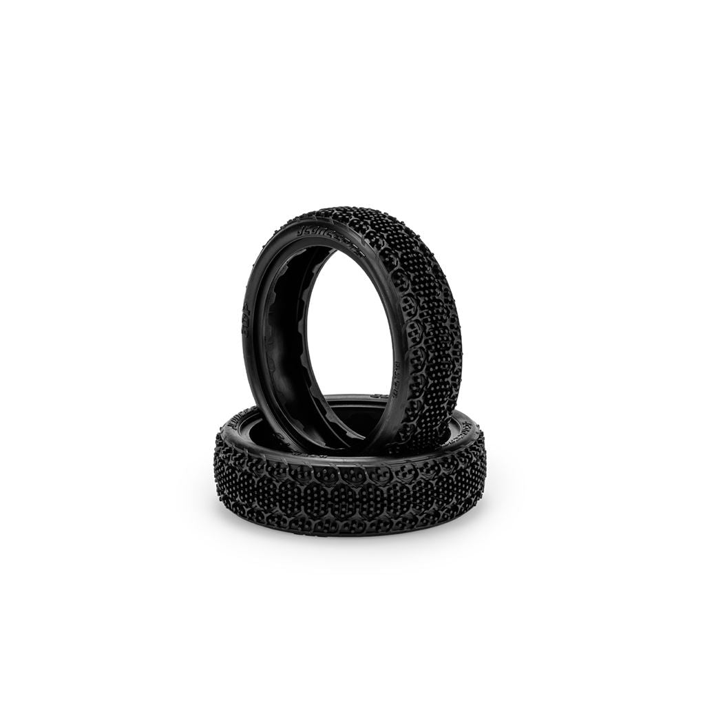 More pins are added in the open spaces utilizing the original concept to allow slightly more space on the outside. A radial ring is added to the outside portion of the upper sidewall to provide low edges of contact patch to the racing surface. The 2.2” bead mounting diameter fits to popular wheels like the #3376 Mono wheels available in bright white and fluorescent yellow. In addition to Mono wheels, JConcepts also offers separately the Pioneer wheels for modern vehicles featuring the raised panel design available in new colors such as retro pink.