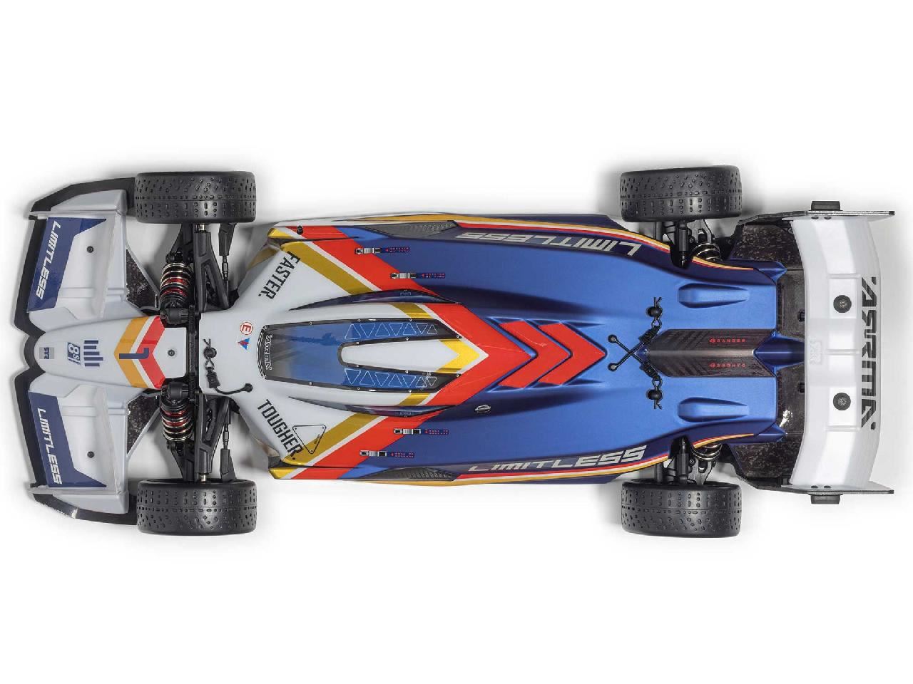 This ready-to-run version of the LIMITLESS includes a low-drag body that's factory-finished in a choice of colors. Wing trim lines can be used to reduce downforce. The full-width front splitter improves traction and handling, and a large rear diffuser reduces turbulence and drag.