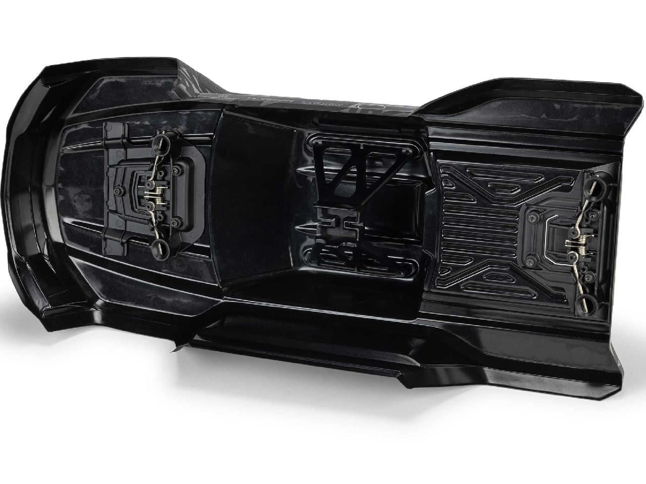 The streamlined, factory-finished KRATON monster truck body now has a quick-release, clipless body retention system that doubles as protection against body punch through.