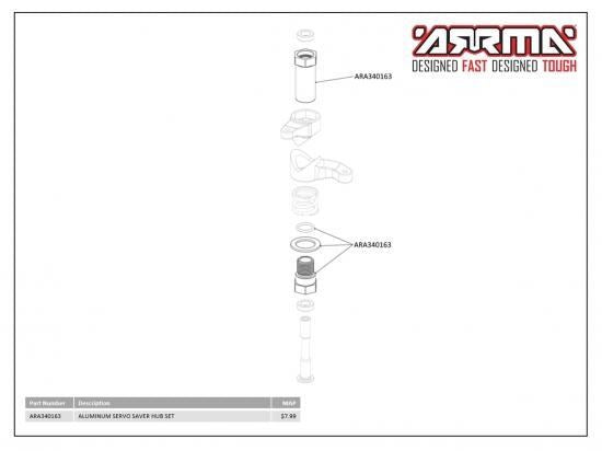 Aluminum Servo Saver Hub Set Features:High-quality lightweight aluminum, anodized in ARRMA red for eye-catching looks - Precision manufactured threads for smooth and easy assembly - 'Never loose' servo saver design means that the servo saver will always be at the optimum setting