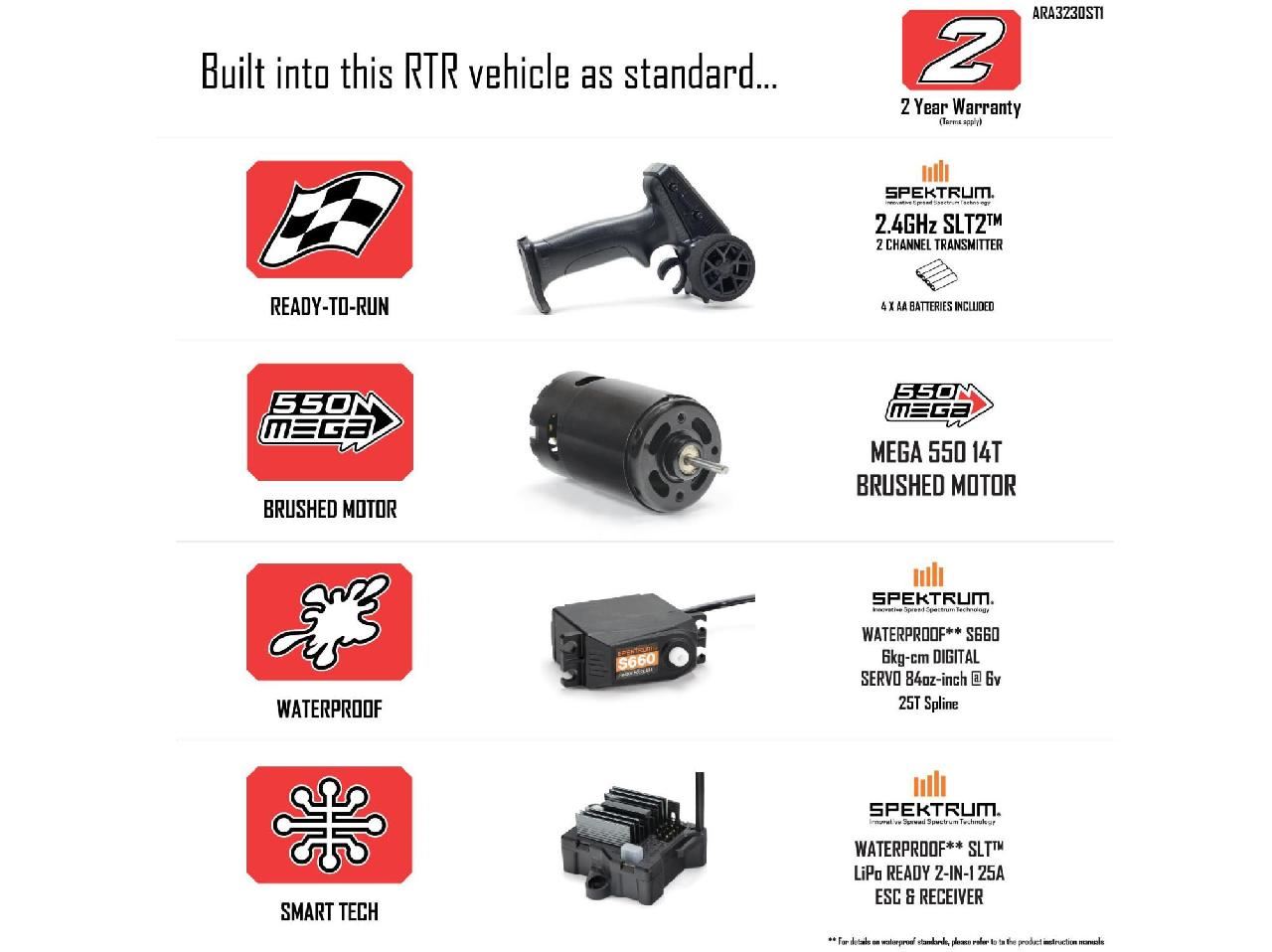 If you're new to RC, the Spektrum SLT2 2-channel radio helps you learn control skills safely by limiting maximum speed to 50% or 75% until you're ready to unleash it all. Bash without worry in wet conditions — the Spektrum 2-in-1 25A ESC/receiver unit and high-torque Spektrum S660 steering servo are both waterproof. (For details on waterproof standards, refer to the product instruction manual.)
