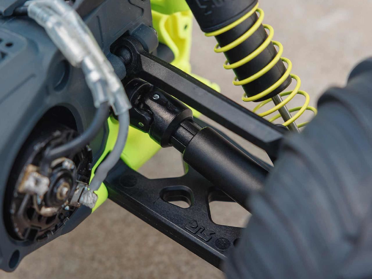 No options are needed for the GORGON MT to make you the centre of attention from the start. Straight out of the box, its strikingly original looks draw a crowd. The body comes factory-finished in your choice of red or fluorescent yellow, with colour-coordinated shock springs, battery tray, skid plates, and front and rear bumpers that resist impacts and help protect those "fang-tastic" graphics.