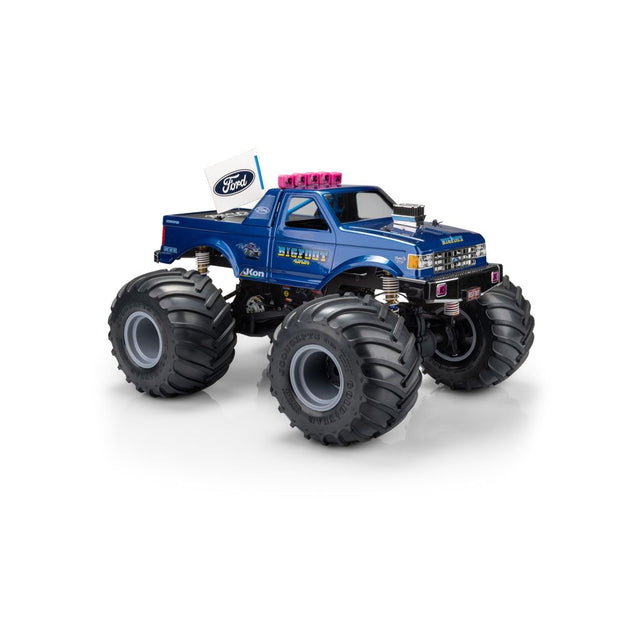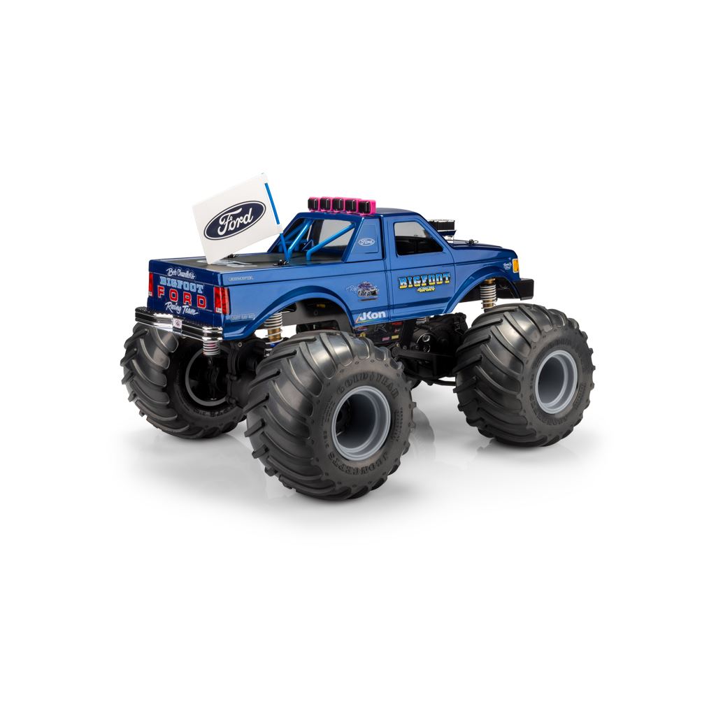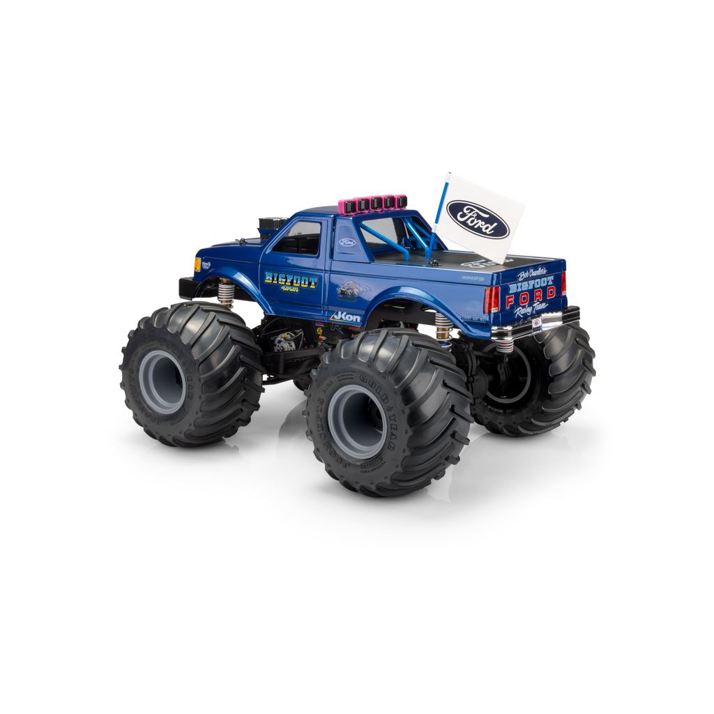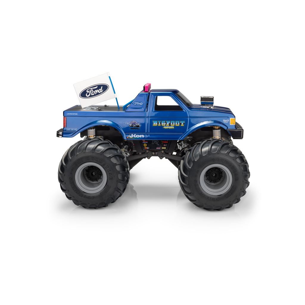 The body set is intended for trucks ranging from 10.50” to 11.00” wheelbase including Clod Buster, Regulator, other custom designed retro trucks. The pre-trimmed BIGFOOT decals peel and stick to the body and include logos associated with the generation of yesteryear, and today. Also included, authentic FORD truck headlight, grille, taillights, decals along with miscellaneous monster truck, street truck, and JConcepts logos. The body arrives clear with window mask and is backed by JConcepts customer service and racing heritage.