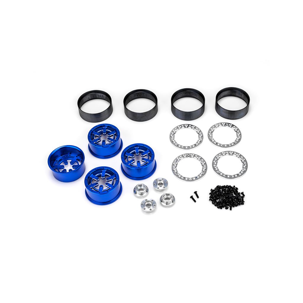 Six heavy-duty 3mm BHCS fasteners lock in the included 4.5mm hex adaptor, while twelve BHCS fasteners secure the bead lock ring to the wheel. The bead lock stands out as the pass-through triangle milled sections allow the blue wheel to shine through to the outside world. Twelve lower hung flange areas rotate about the center and provide additional room for the securing button head screws. Chamfered sections provide additional finished look details to finish off the design.