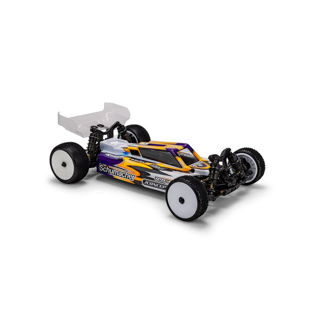 JConcepts continues to re-write the script when it comes to off-road body design, development, and styling. It is difficult to find a more successful body shell than the F2 design by the creators from Groveland, Florida. As the release drops of the Schumacher Cat PB, JConcepts set off to incorporate all the functionality of the IFMAR World Championship winning shell and wrapped it around the newest dynamo. The exclusive composition of the cab, extra rear windows, louvered roof all tied together with Finnisher “V” configuration makes the F2 a classic performer.