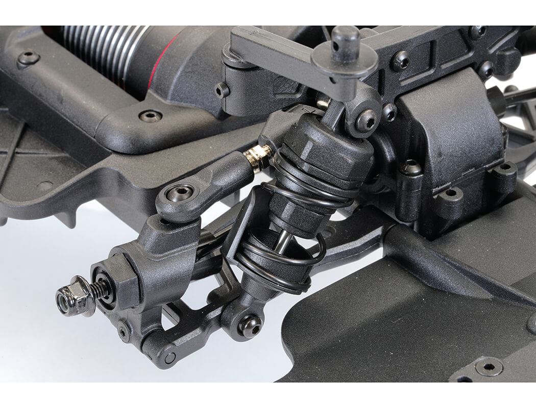 Oil filled shock absorbers, anti-roll bars and adjustable double wishbone suspension lets you tweak to suit your settings and tyre choice; either treaded rubber tyres for street racing, featuring 25mm wide front and 30mm wide rear for better stability at high speed or hard plastic boots on 6-spoke wheels for sideways drift driving.