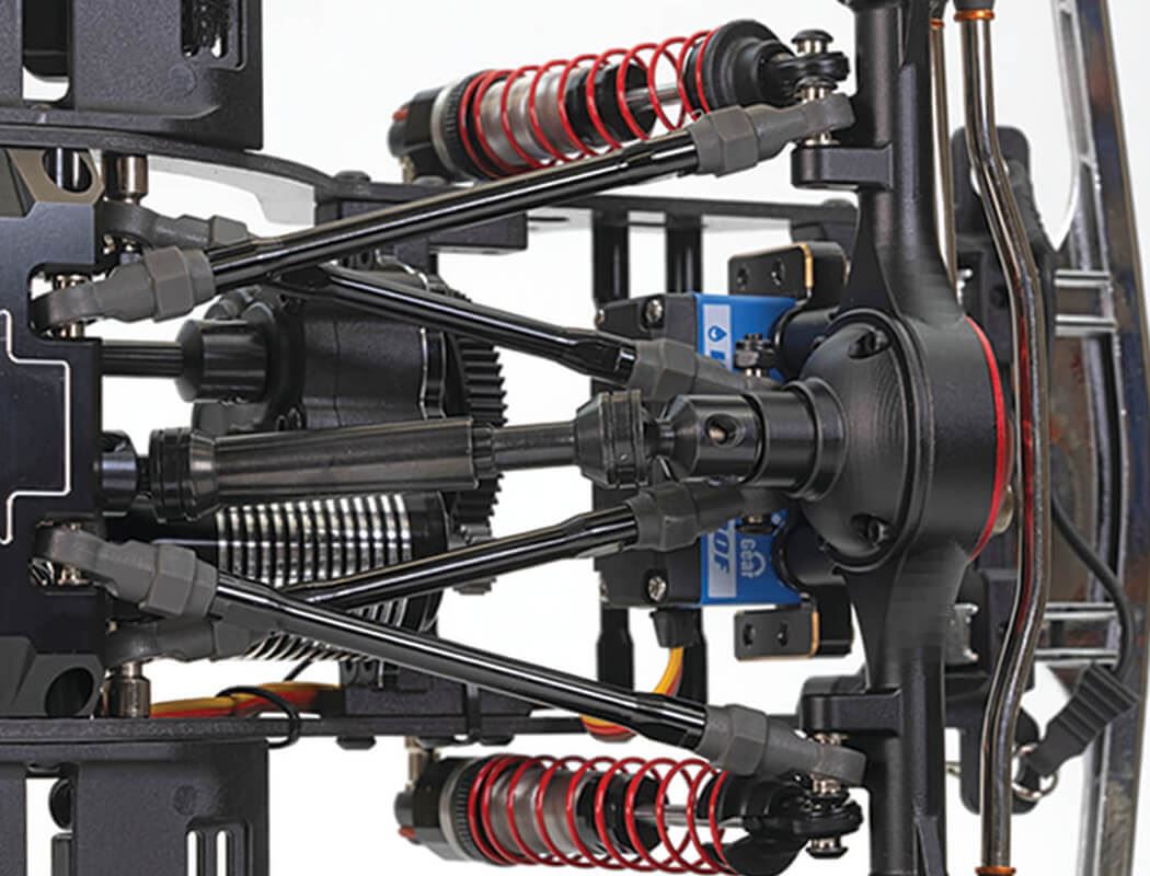 CNC aluminium chassis parts come as standard on the Ruffneck, with front and rear axles, motor plate, lower centre chassis plate and steering hubs all machined to the highest quality. Steel front CVA driveshafts and centre driveshafts handle the torque from the reduction drive transmission which features metal gears and steel reduction shaft with a final drive ratio of 37:1 for those steep, slow inclines.