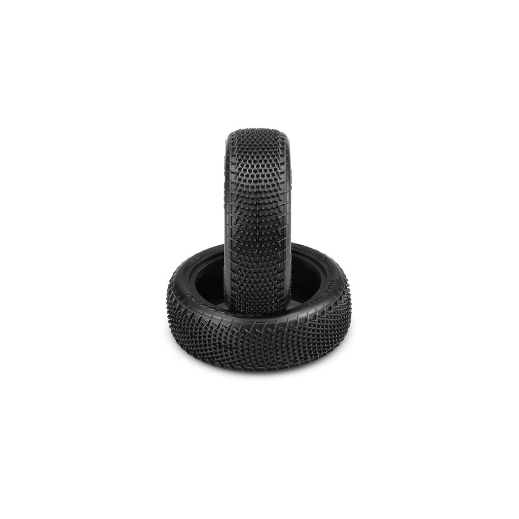 The alternating rows of pins provides side-bite, increased steering response and the tightness of the package creates a nimble racing vehicle. The arrangement of the pins promotes good wear characteristics and traction longevity. The Fuzz Bite incorporates a small radial rib on the outside with angular cross to give consistent cornering but also additional mid-corner steering and improved forward acceleration.