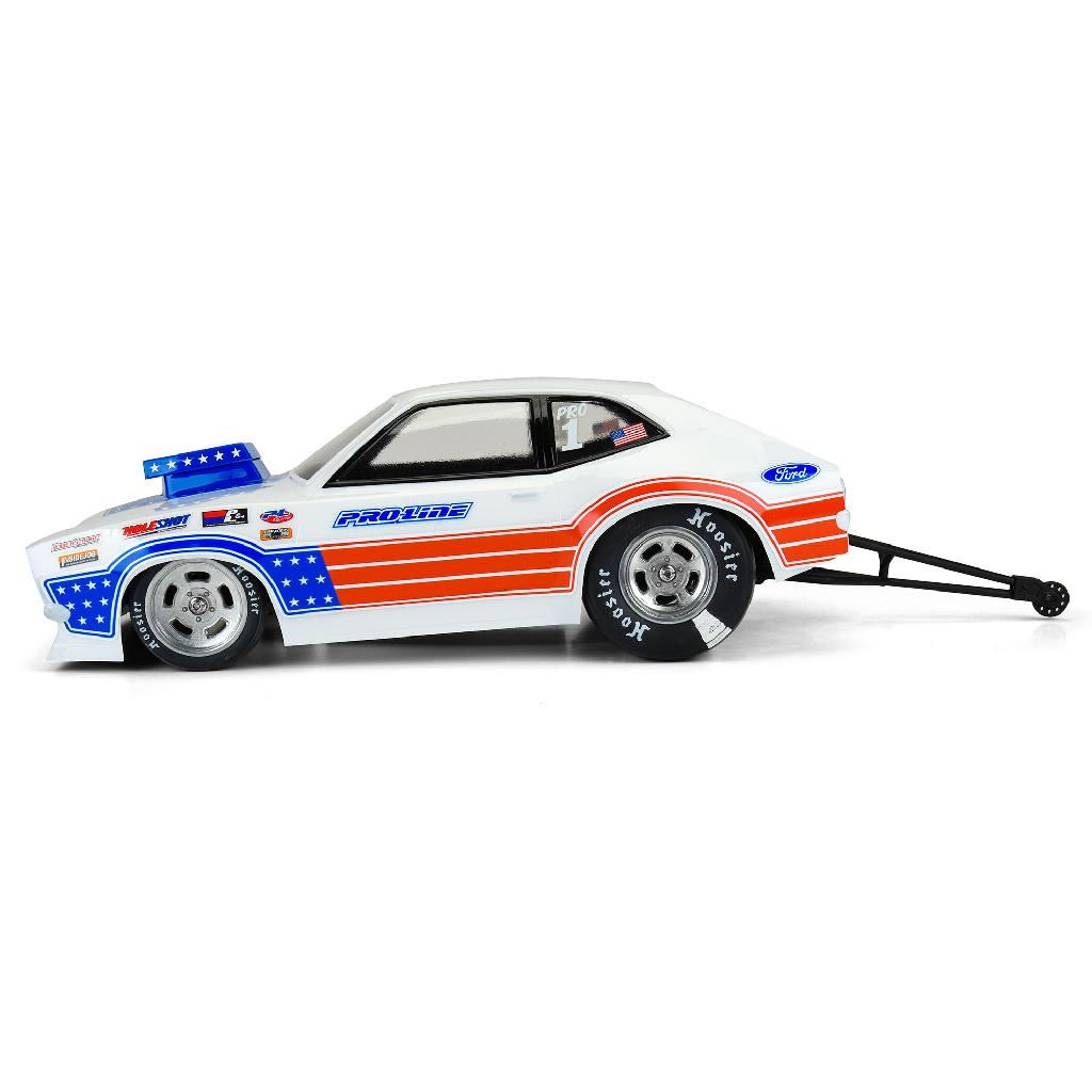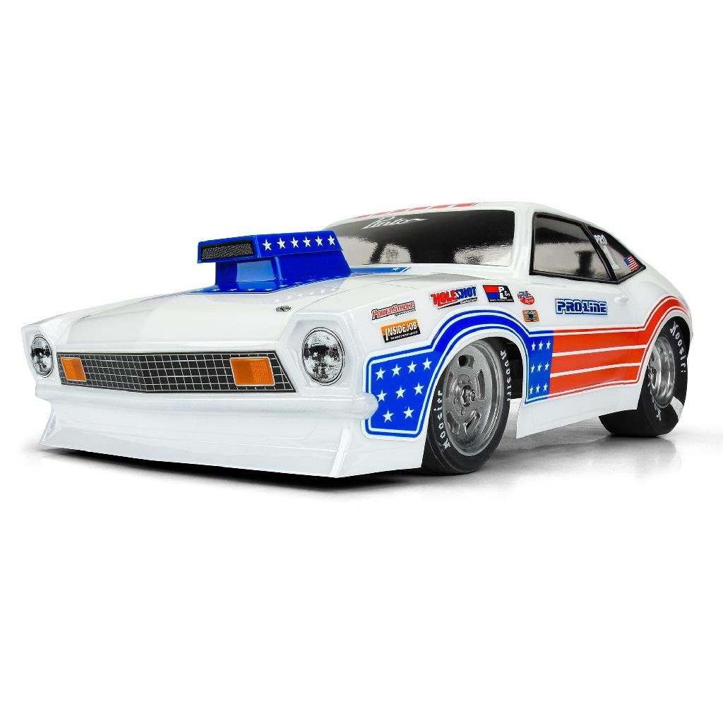 Pro-Line is ready to break the mold once again with an all-new take on drag racing. Introducing the first subcompact car that Ford® ever produced that went on to become an iconic Pro Stock car from the '70s in full-size racing: the 1972 Ford® Pinto! To make the Pinto as scale as possible relative to Pro-Line's other Drag Bodies, Pro-Line is launching a new subcompact drag class using the Bandit® (with PRO607000 body mounts), AE SR10, or other 11.25" wheelbase 2wd Buggies fitted with drag racing wheels and tires. This new size opens the door to bring new people into the world of drag racing using a chassis platform that many people already own. All the iconic details from the original 1972 Pinto have been faithfully recreated in 1/10 size that looks incredible with big drag tires. The front end of the body features massive undercut details including the classic hexagon-shaped headlight bezel just like the full-size car, which is only made possible with Pro-Line's proprietary molding technology. The body comes clear giving you the option to paint the body however you desire. If you are a Pinto fan or you are ready to try something different, then this is a must-have body for you! Get your own 1972 Ford® Pinto body today!
