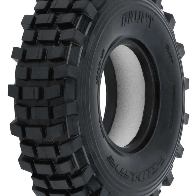 This is a pair of Grunt 1.9" Rock Crawling Tires. Pro-Line is ready to equip and mobilize the fleet of military crawlers with the all-new combat-ready Grunt 1.9" tires! The Grunt has been designed from the ground up to give your military build the scale looks and performance that you need to outmaneuver the enemy. Coming in at 4.4" tall by 1.4" wide the Grunt 1.9" the tire is the perfect size for single or dually military tire applications. The tread features alternating rows of 3 tread blocks that will charge through trenches and take no prisoners. The stepped sidewall not only looks scale but also adds protection from sharp jagged rocks. The Grunt 1.9" tires are made from Pro-Line's legendary G8 rock crawling compound, so you know they will have the grip you need. Gain the high ground with Pro-Line's new Grunt 1.9" Rock Crawling Tires. Get yours today!