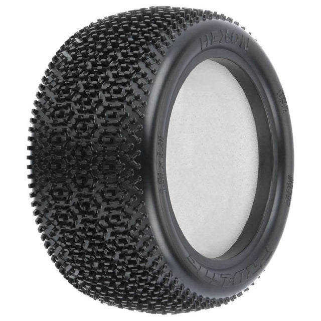 Introducing the all-new Pro-Line Hexon Carpet Buggy Rear race tire! The Hexon features a hexagon pattern of uniquely shaped pins that provide longer-lasting tread and more consistent performance than previous generation carpet tires. Just like the Prism 2.0, the Hexon features a low profile tire carcass shape that lowers your car's center of gravity for improved corner speed. The Hexon pins are positioned with the flat edge pointed front to back for maximum forward grip and are narrow when viewed from the side to reduce traction rolling. This new tire also features a directional side tread so you can tune the performance of your tires to the current track conditions. You can choose to mount the standard pins on the outside for a more aggressive grip, or mount the vertical side pins to the outside for a more forgiving grip. The Hexon tire is another leap forward in the hot carpet racing scene; be the first with the fastest carpet tire yet - Pro-Line's new Hexon!