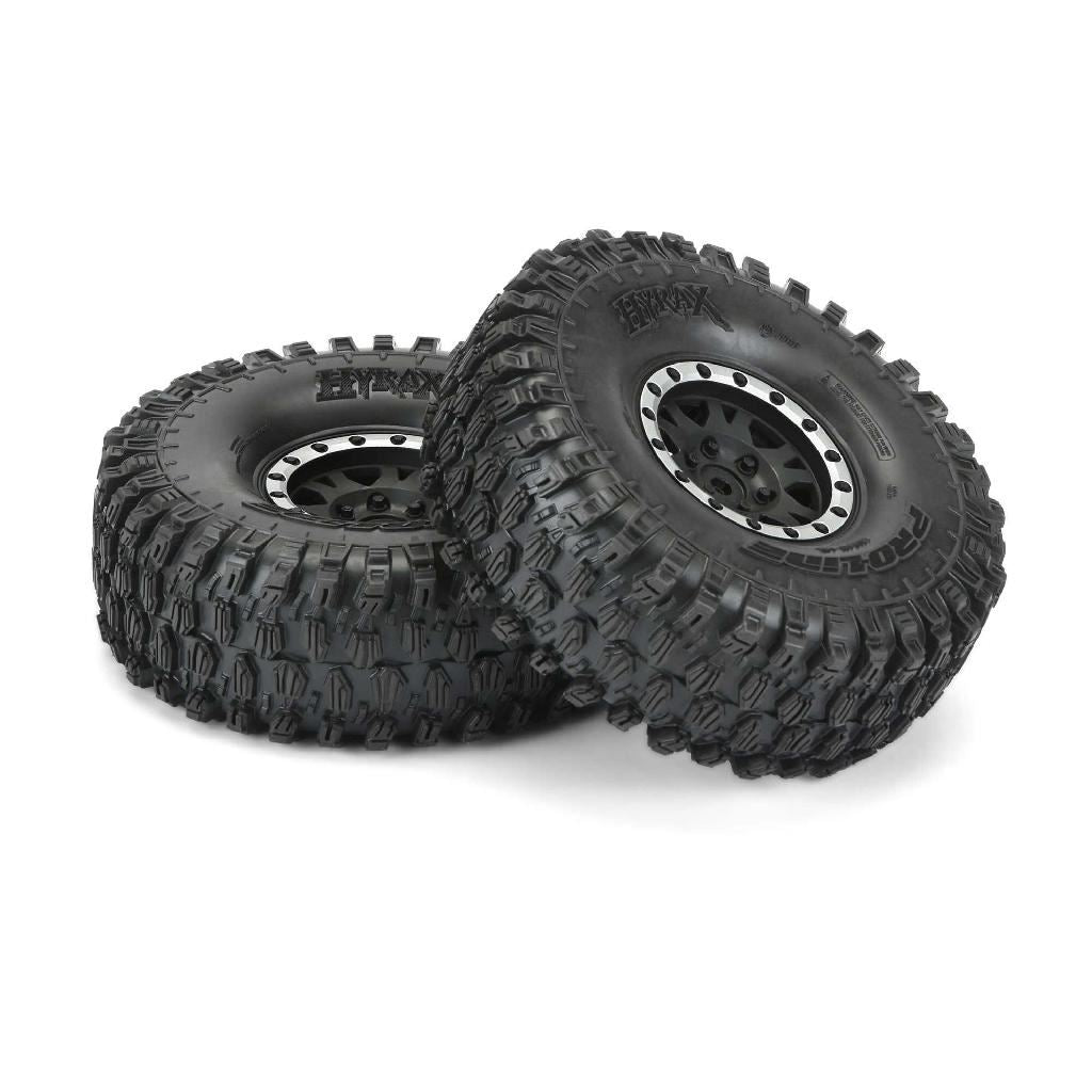 This is a pair of pre-mounted Hyrax 1.9" Tires. The future of 1.9" Tire Performance has arrived with Pro-Line's Hyrax Tire mounted to Impulse Black/Silver Wheels! Designed for maximum grip on the toughest terrain, the Hyrax tire is ready for anything your Scale Adventure might throw at you. The Hyrax features an aggressive and open tread pattern with each tread block containing multiple Sipes for incredible tread flex. The highly detailed connected tread on the sidewall of the Hyrax extends out for unmatched side-hilling performance. The Hyrax also features futuristic stepped tread blocks that create even more forward gripping edges that dig into slick rock like no other scale tire Pro-Line has produced to date!