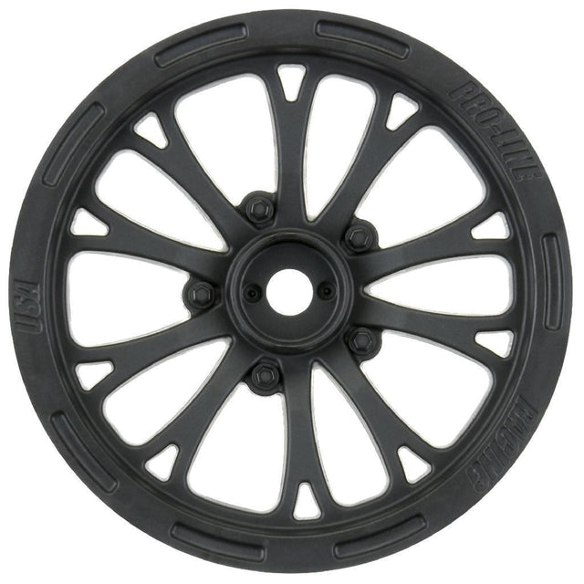 This is a pair of Pomona Drag Spec 2.2" Black Front Wheels. Do you need high-performance and perfectly styled drag wheels for your no-prep SC drag car? Pro-Line has you covered with the all-new Pomona Drag Spec 2.2" Black front Wheels! The Pomona wheels were specifically made for no-prep Drag racing and are a perfect fit with Pro-Line's Hoosier Drag 2.2" Front Tires! The Pomona wheels are strong and lightweight 12mm hex wheels making them the ideal choice for performance drag racing. The wheel spoke design mimics what you would find at the Pomona Drag Strip on any given race weekend and will complete the look of your build. The Pomona wheel offset is ideal for the Losi® 22S™ No Prep Drag Car, 2wd Slash® trucks converted to no-prep Drag Racing cars and AE DR10, which has exploded in popularity. The Pomona Drag Spec wheel and every other wheel that Pro-Line makes is proudly Made in the USA. Launch your no-prep Dragster to the next level with the Pro-Line Pomona Drag Spec Wheels today!