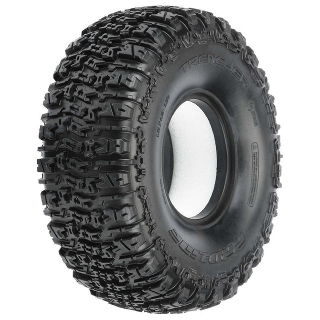 This is a pair of Trencher 1.9" Rock Crawling Tires. The almighty Hyrax finally has some real competition with Pro-Line's all-new 1.9" (4.75" Tall x 1.81" Wide) Trencher Tire! Inspired by Pro-Line's insanely popular all-terrain Trencher tread, this Class 1 legal crawler tire is ready for anything your Scale Adventure might throw at you. The Trencher 1.9" features an extremely aggressive tread pattern with each tread block containing multiple sipes and multiple levels for incredible tread flex while still looking great on a Scale Rig. The highly detailed connected tread on the sidewall of the Trencher extends out for great side-hilling performance that only slides out when you want it to! The Trencher 1.9" tire is made from Pro-Line's Legendary G8 material and Super Soft Predator Compound, so you know it provides the performance you can depend on. The future of 1.9" tire performance is here with Pro-Line's new Class 1 Trencher tires! Get your own set of Trenchers today!