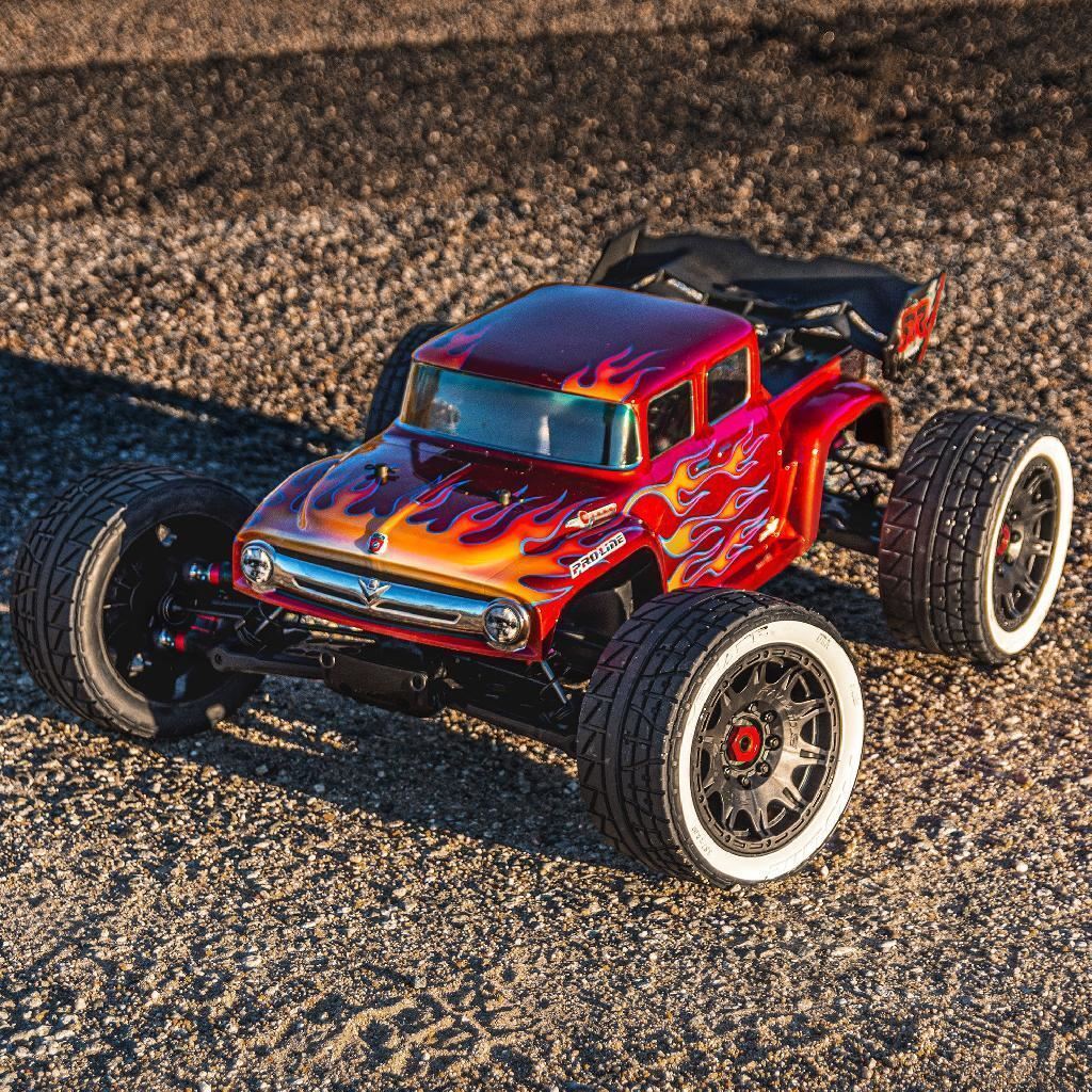 This is a 1956 Ford® F-100 Clear Body for Kraton™ 8S. Pro-Line is excited to bring some retro classic styling to the Kraton™ 8S for the first time! This old-school Ford® F-100 body completely transforms the look of your truck, featuring a custom hot-rod style extended cab, aggressive fender flares, and the iconic old-school chrome grill of the '56 blue oval fan favorite. Pair the F-100 with the Menace 5.7" Belted Tires (PRO1020510) for a true street machine combo!