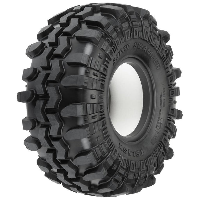 This is a pair of Interco® Super Swamper® TSL SX 2.9" Crawler Tires. Under official license from Interco® Tire Corporation, Pro-Line is proud to announce the gnarliest tire yet for the 1/6 SCX6™ rock crawler: the legendary Super Swamper® TSL SX! With "almost scale" not being acceptable and access to Interco's® design data, Pro-Line's engineering staff has reproduced the original Super Swamper® in a scale configuration matched by none. At a massive 7.15" tall by 3" wide, the Swamper® adds a whole new style to your rig, perfectly combining scale looks with the legendary G8 compound for unmatched rock crawling performance.