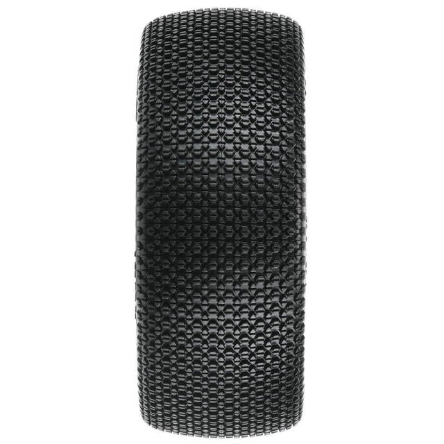 This is a pair of pre-mounted Slide Lock 1:8 Buggy Tires. The Slide Lock is a unique tire design from Pro-Line that is made specifically for smooth, low grip tracks. The Slide Lock features a pattern of small, tightly packed hexagon and triangle shaped pins so you can lay down as much rubber as possible. The tread on the new Slide Lock is laid out wider across the tire carcass for a flatter profile overall compared to other Pro-Line 1:8 Race Tires. Each hexagon pin has a deep sipe down the middle of the tread for added flex and grip on even the slickest of surfaces. The built-in tread flex means you can run harder compounds for longer wear and still have good traction when you need it. The large and stiff side pins reach far down the sidewall to reduce edginess as much as possible.