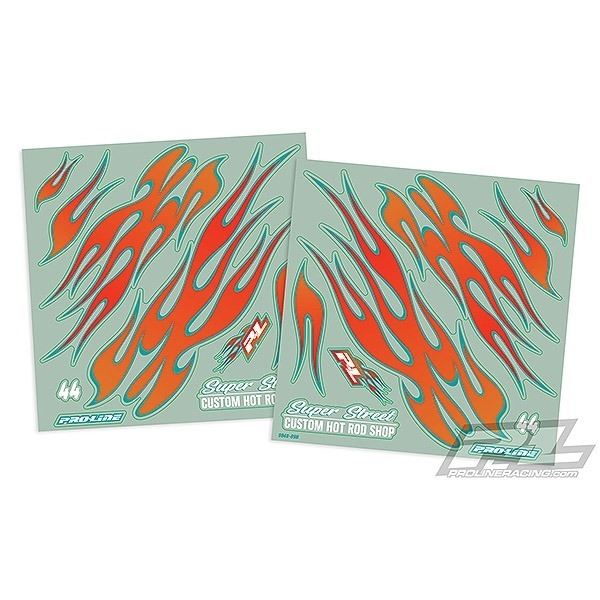 This is a Hot Rod Shop Universal Graphics Kit. Do you want to transform the look of your RTR body, Pro-Line tough color body, or even your custom painted body? Look no further than Pro-Line's new Hot Rod Shop Universal Graphics kit! This sticker kit fits most 1:10 and 1:8 bodies on the market and features Hot Rod style flames in various sizes to make your car or truck stand out from the rest. It even includes small P-L logos in the flame Hot Rod style to complete the look! All the stickers included with this graphics kit are pre-cut and they are thicker than normal making them tougher and easier to install than your average decals. Add some Hot Rod flames to your ride with Pro-Line's new Hot Rod Shop Universal Graphics Kit! Available now!