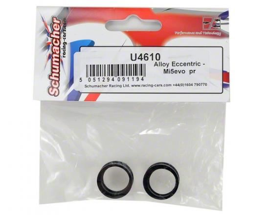 This is a pack of two optional Schumacher Alloy Eccentrics. These CNC precision alloy eccentric's for the Mi5evo replace the standard plastic part for greater precision and accuracy when adjusting the belt tension.