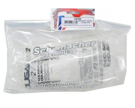 This is a replacement Schumacher Clear Body with Decals, and is intended for use with the Schumacher Cougar SV2 1/10 scale buggy. This body includes a decal sheet, but does not include the window masks, (SCHU4052).
