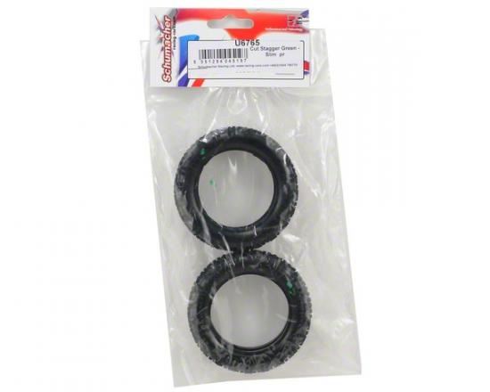 This is a set of two Schumacher "Cut Stagger" Slim 1/10 2WD Buggy Front Tires, in Green (Medium) compound. These tires are similar to the "Stagger Rib" tread pattern, but the lugs have been cut in half. This doubles the amount of lugs on the tire, making them better suited to loose conditions.