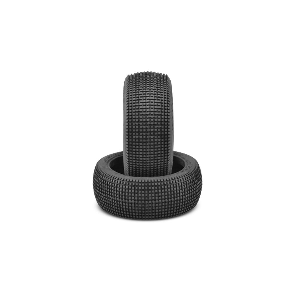 The stacked row configuration and simple connected pins offer massive forward acceleration. The aligned rows allow some surface drift making the tires forgiving in sand and bumpy track sections. The outside pin has been clipped to help drive-ability and ease the initial turn-in drivers often have concern for. The JConcepts tires include the Dirt-Tech closed cell inserts made famous by their gray color and durability. The package is complete with re-sealable, zip-top packaging and backed with JConcepts customer support and racing heritage.