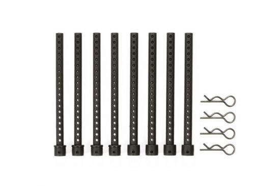 This newly-designed body mount extension piece and snap pin set allows you to extend body mounts on your RC model car. They are intended to be used on those body posts which have been shortened for use with other bodies. They are compatible with a wide range of major Tamiya touring car and M-Chassis models.