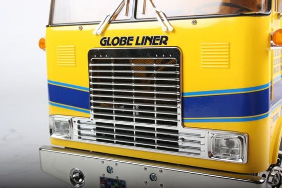 Tamiya has captured the attractive appearance of tractor trucks in a 1/14 scale electric powered Globe Liner . The rear double axle drive uses rigid propeller shafts for smooth performance.