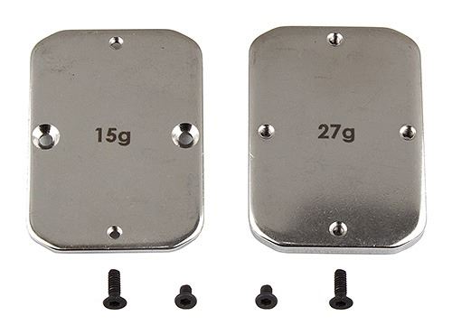 These 15 gram and 27 gram chassis weights key into the front chassis pocket. Adds weight to the front of the B64 and B64D, giving more steering in high-grip applications. Mounting hardware included.