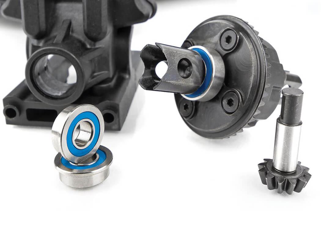 - RC8B4 gearboxes are included in the latest hard material used on RC8T4: Front gearbox features a 3.5 deg. inclined pinion gear angle to straighten the center driveshaft for increased drivetrain efficiency and reduced phasing and vibration. Both gearboxes feature large bearing sizes, 6x13x5mm flanged bearing results in longer life of bearings and ring and pinion gears.