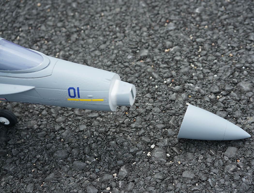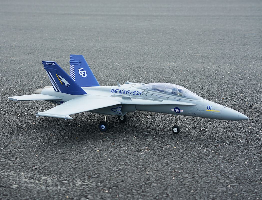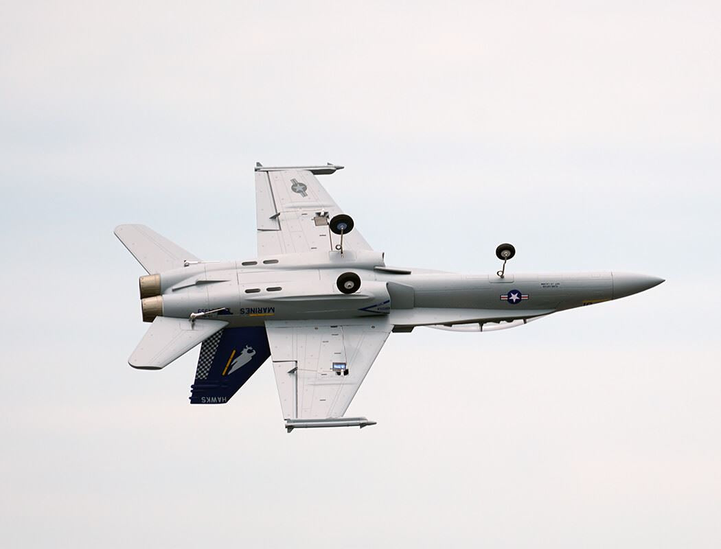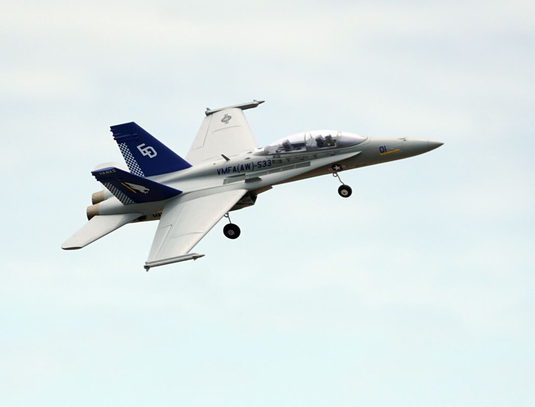 The factory-installed power system, including twin efficient 1413-KV5500 brushless motors and twin 20A brushless ESCs, paired with a 4S LiPo battery, delivers an abundance of thrust for fast climbs, rolls, loops and endless fun for high alpha flying due to the F-18’s low wing load and full flying stabs. A flight time of around 3-8 mins can be achieved with proper throttle management.