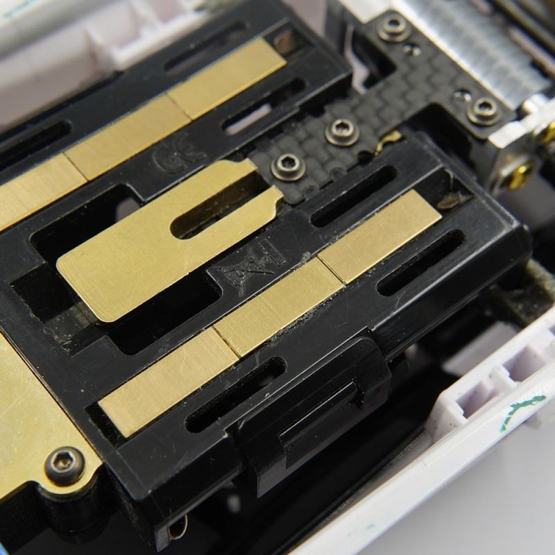 Lower the center of gravity of your Kyosho MR03 chassis with these brass pieces to add stability and reduce the chance of traction roll!