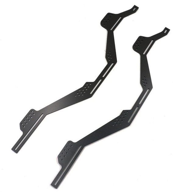 Graphite cut crawler frame rails for you to custom upgrade your rig to a graphite rails! By changing to these lighter rails, you will be effectively lowering the center of gravity whilst retaining the rigidity of the chassis! Long slits cut in the front, back and center for you to install your favourite bumpers, transmission cases and more! Specially cut damper mounting holes means you can tune the droop of your rig as well as placing your dampers in a position you want regardless of the wheelbase.
